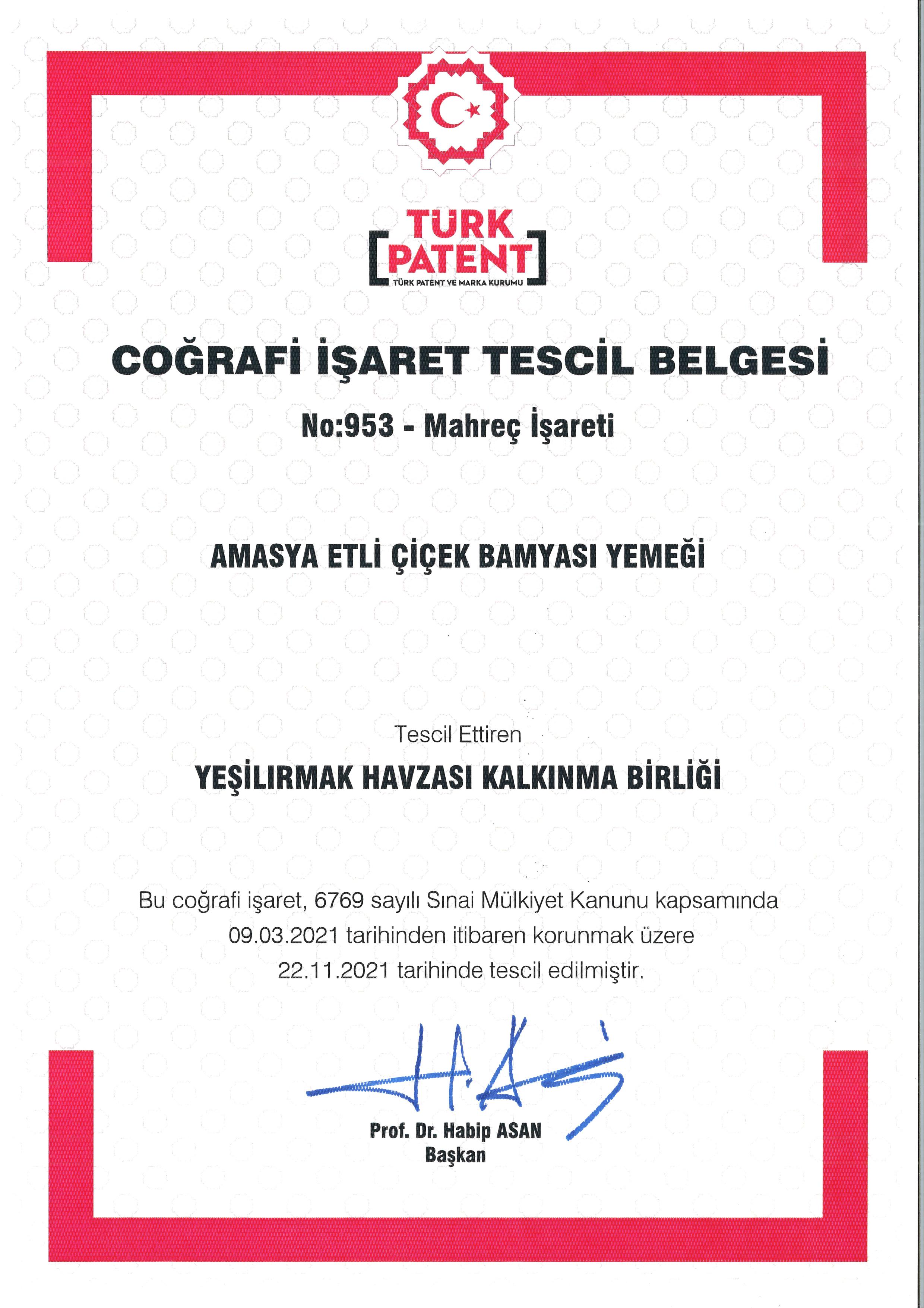 Geçen yıl göreve geldiğimizde, ilimizin 4 adet coğrafi işaret tescili bulunmaktaydı. Bizler YHKB ve Belediye Başkanlığımızla birlikte, başta gastronomi ağırlıklı olmak üzere ilimize ait coğrafi işaretlerin arttırılması yönünde çalışmalarımıza başladık. Bu çalışmalarımızın sonucunda, sizlerin de takip ettiğiniz üzere, bundan yaklaşık birkaç ay önce Baklalı Dolma ve Amasya Çöreğini ilimize tescillemiş olduk. Bu sayede 4 olan coğrafi işaret tescil sayımız 6’ya çıkmış oldu.